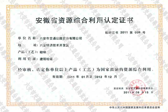 安徽省資源綜合利用認(rèn)定證書(shū)
